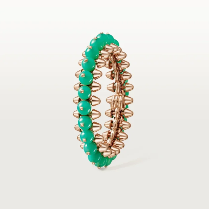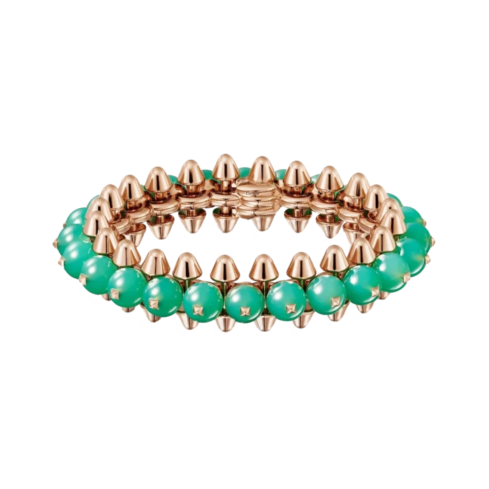 The Clash de Cartier bracelet is a modern, edgy piece characterized by its unique clash of textures and materials. It combines traditional craftsmanship with a bold, avant-garde aesthetic. The bracelet features a mix of smooth, round studs and geometric patterns, making it a statement of individuality and luxury. It is crafted from high-quality materials, such as 18k gold, and is often adorned with diamonds or other precious stones.